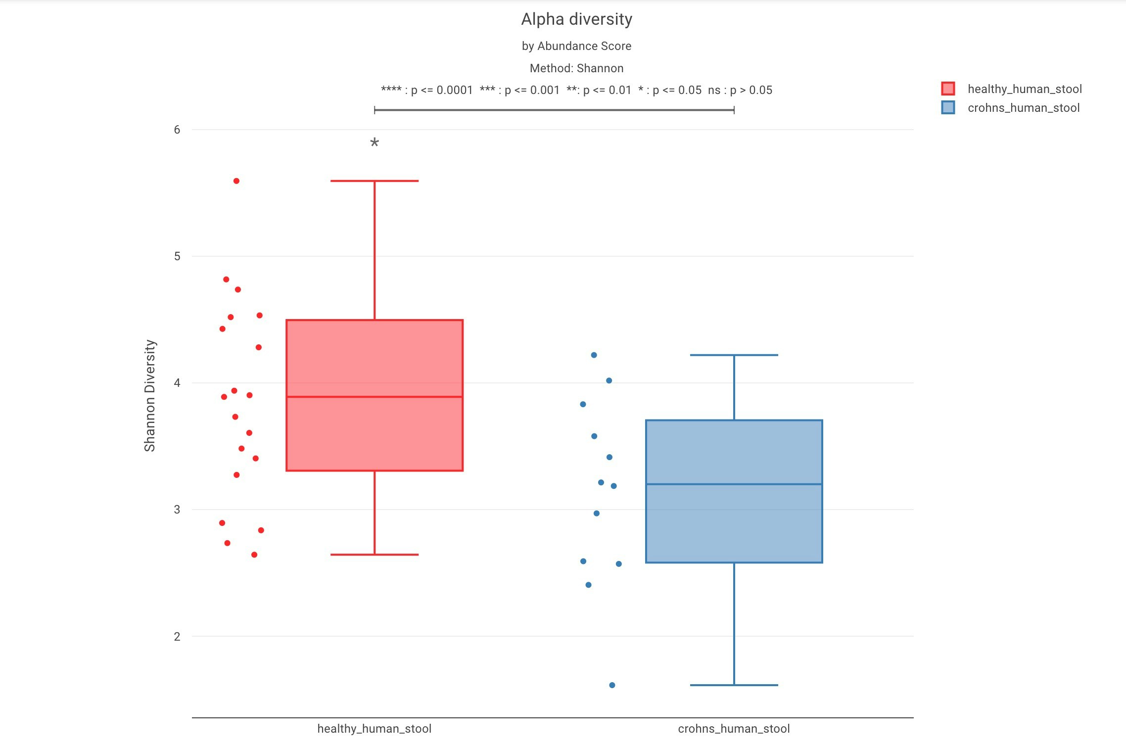 How does this test work and what do the results mean?This non-parametric statistical test investigates whether two independent cohorts have significantly different alpha diversity distributions. The null hypothesis is that a randomly selected value from one cohort has an equal chance of being greater or less than a value from another cohort.P-values below 0.05 indicate a significant difference, meaning the cohorts have distinct alpha diversity distributions. A negative test statistic indicates that Cohort 1 has a lower median alpha diversity compared to Cohort 2, while a positive statistic indicates the opposite.Viewing the Test ResultsAbove the alpha diversity charts, the Result Switcher allows viewing results for “ALL” cohorts or only those with “SIGNIFICANT” differences (p<0.05). The default is “NONE.”The Cohort Menu offers additional filtering, enabling selection of specific cohort combinations to display test statistics and p-values. Results can be exported as TSV.Statistical P-values can also be visualized on the boxplot by turning on the add wilcoxon overlay toggle