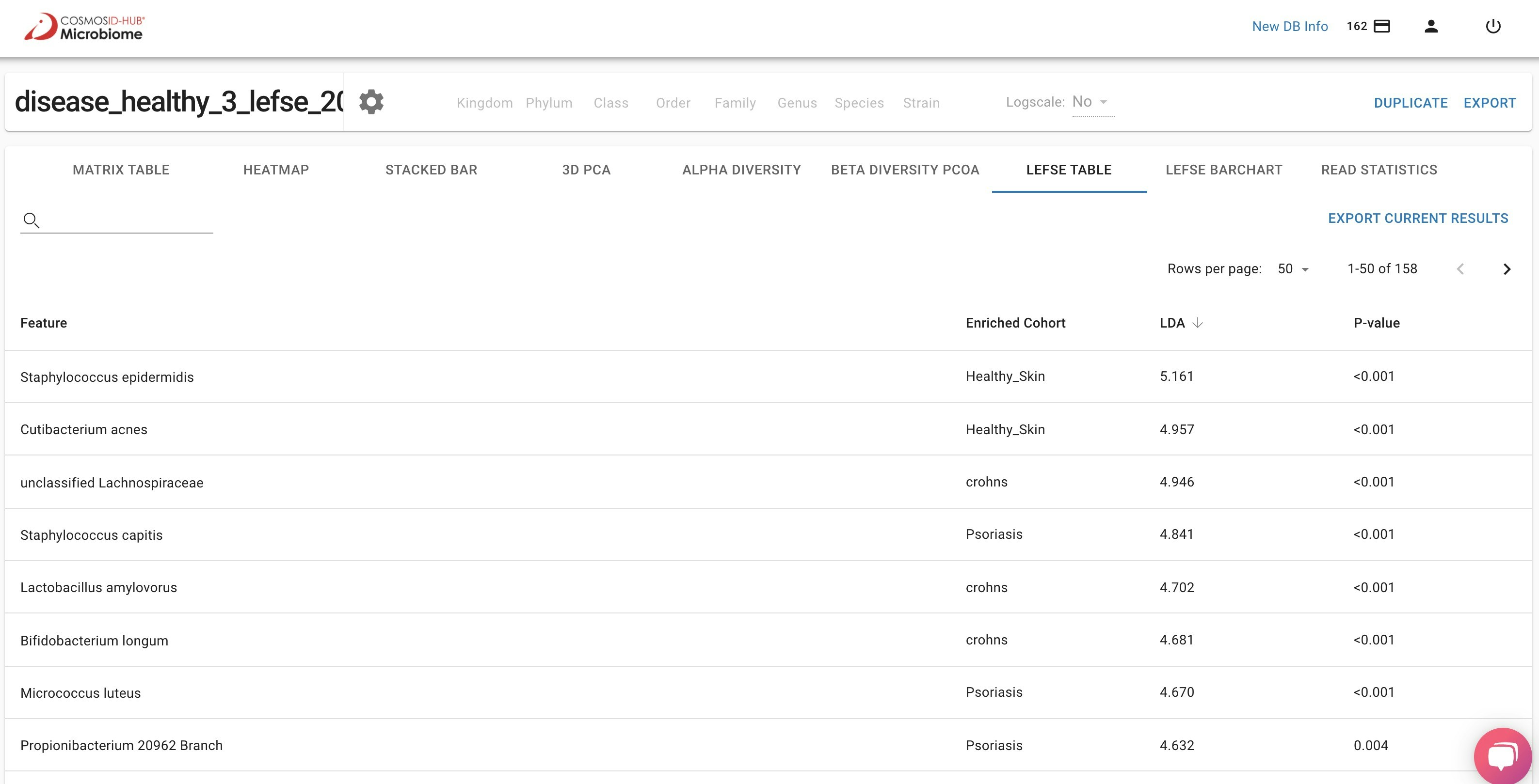 LEFSE Table comprises of 4 columns. The column description is given below.- Feature: The feature column lists out the feature name that has been found to be discriminative among cohorts