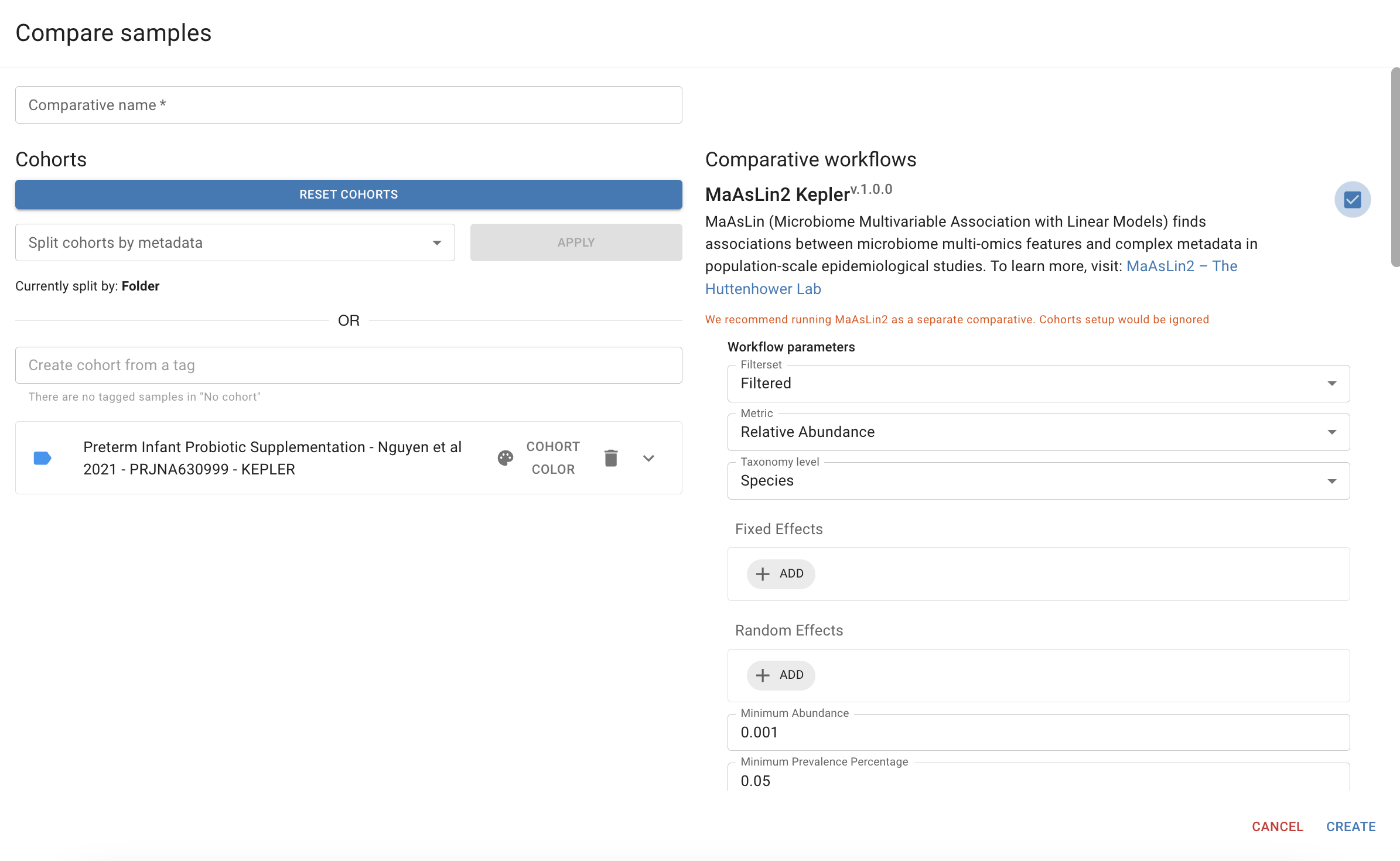 Select one of the following workflows depending on your input data:- MaAsLin2 Kepler-Taxa - conduct differential abundance analysis on Taxa-Kepler results for host agnostic profiling