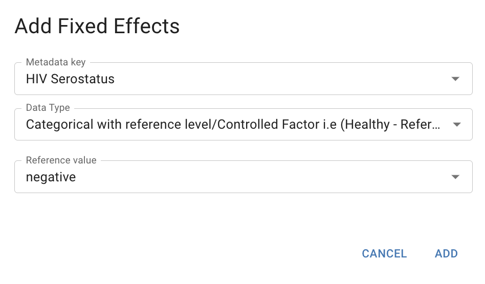 Fixed effects are metadata variables that relates to your hypothesis. These are the primary variables that you are interested in obtaining specific comparative results against. A fixed effect must have 2 or more groups for comparison (we recommend a max of 5 groups). For example, a fixed effect could be:- “Condition” [Control vs. Treatment]