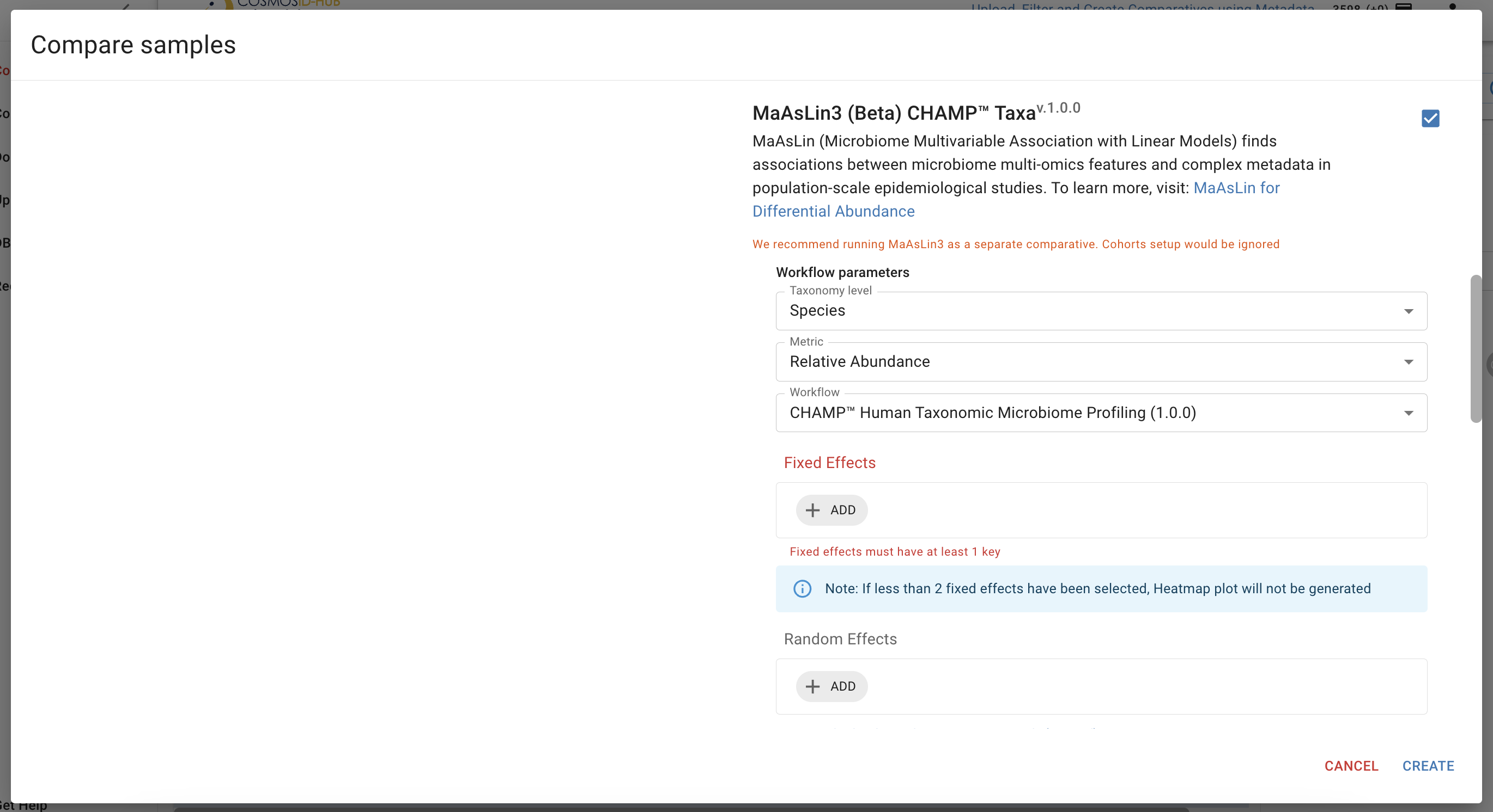 Before running MaAsLin3, you will need to process your .fastq files through one of the taxonomic or functional workflows available within the Cosmos-Hub. You will also need to add metadata to each of your samples to define cohorts needed for comparative analysis. Ensure your metadata encompasses all variables that you want to measure and that may affect your results, with clear groupings for main comparative variables.