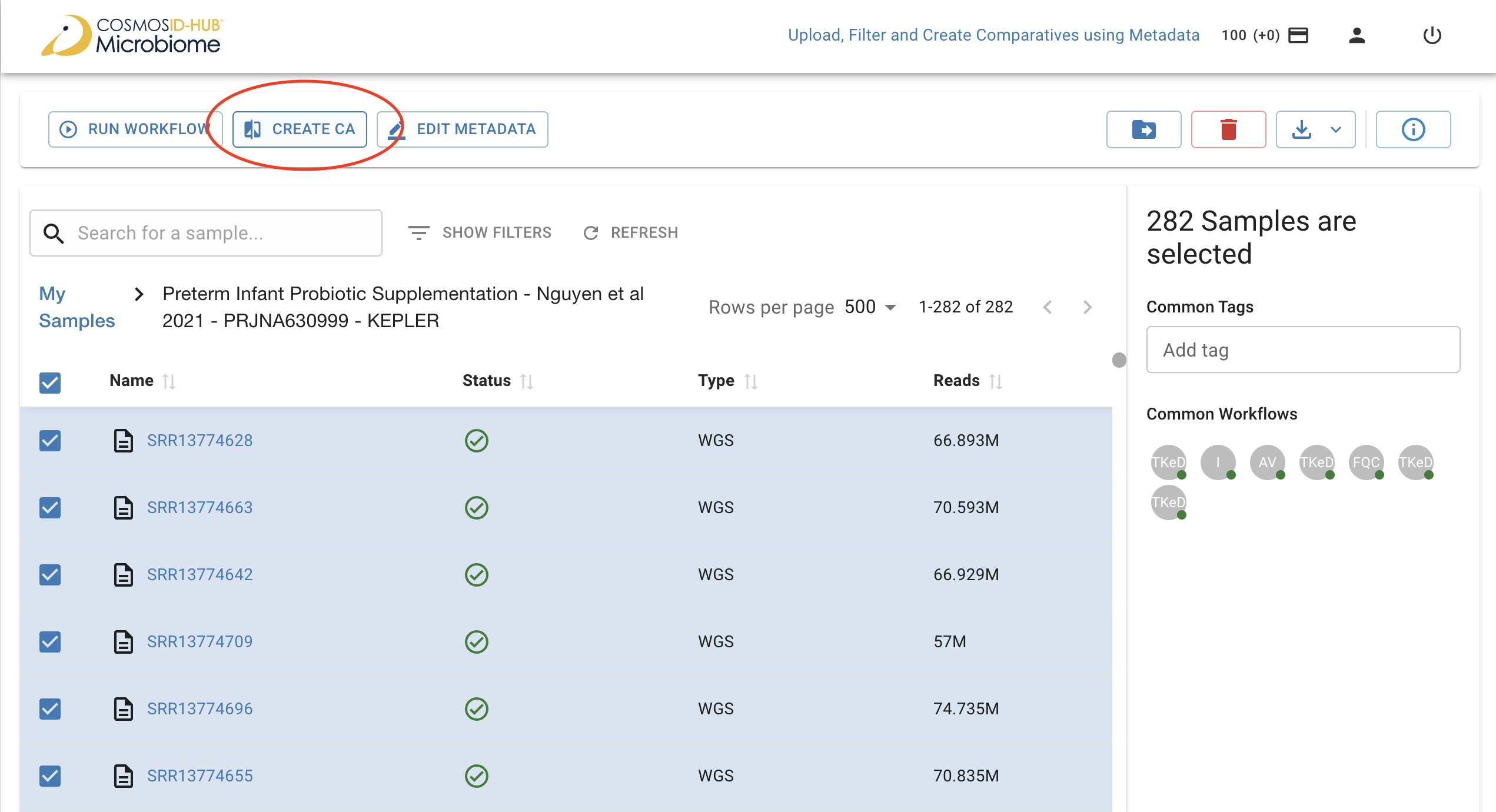After profiling, select the samples that you would like to compare in the “Cohorts and Metadata” menu and click “Create CA” to initiate the configuration of your parameters.