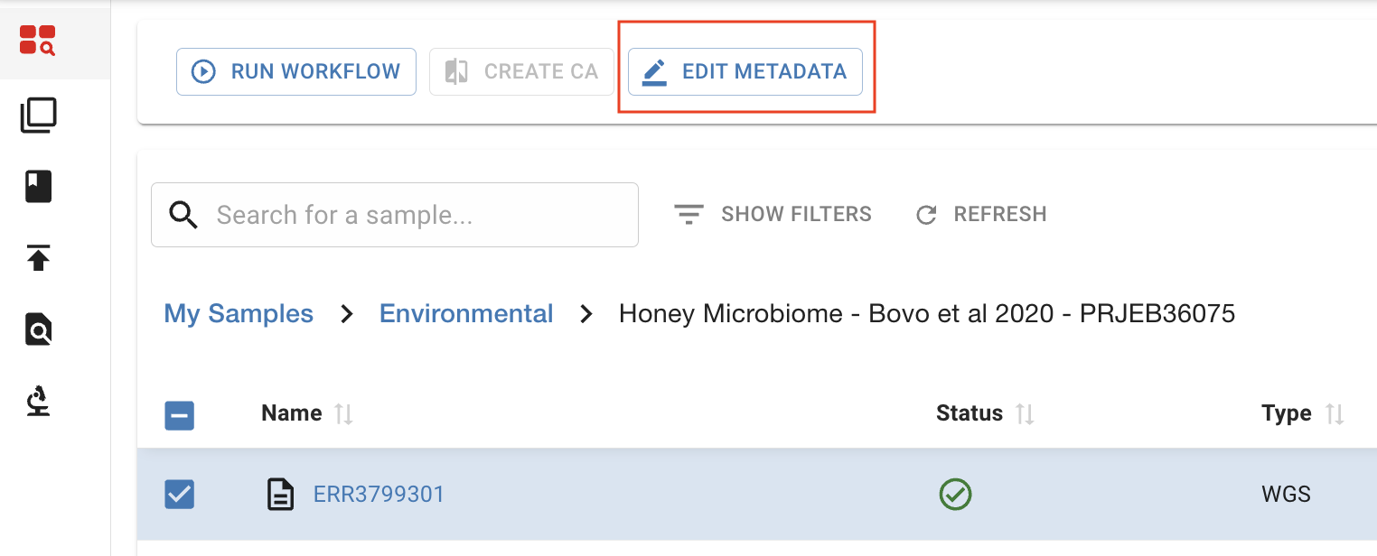 When Editing Metadata for multiple samples, select all files and download the template CSV.Filling up the Metadata CSV Upload Template Form: