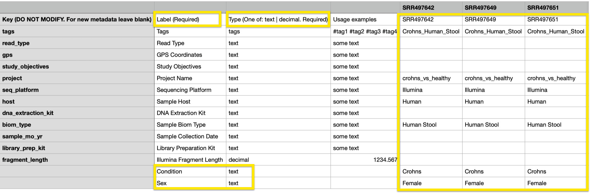 At the upload stage, you will be asked to download a Metadata CSV Form for all of your samples. The form is in long format with columns representing your different samples and rows representing your metadata fields. The first two rows needs to stay constant and are not modifiable. From Third row till Fifteenth row represents system metadata fields which are optional fields to fill out if its relevant to your project. Fields that needs to be filled out for custom metadata are- Second Column and Fifteenth row onwards:- Custom Metadata Field Label without any special characters and spaces