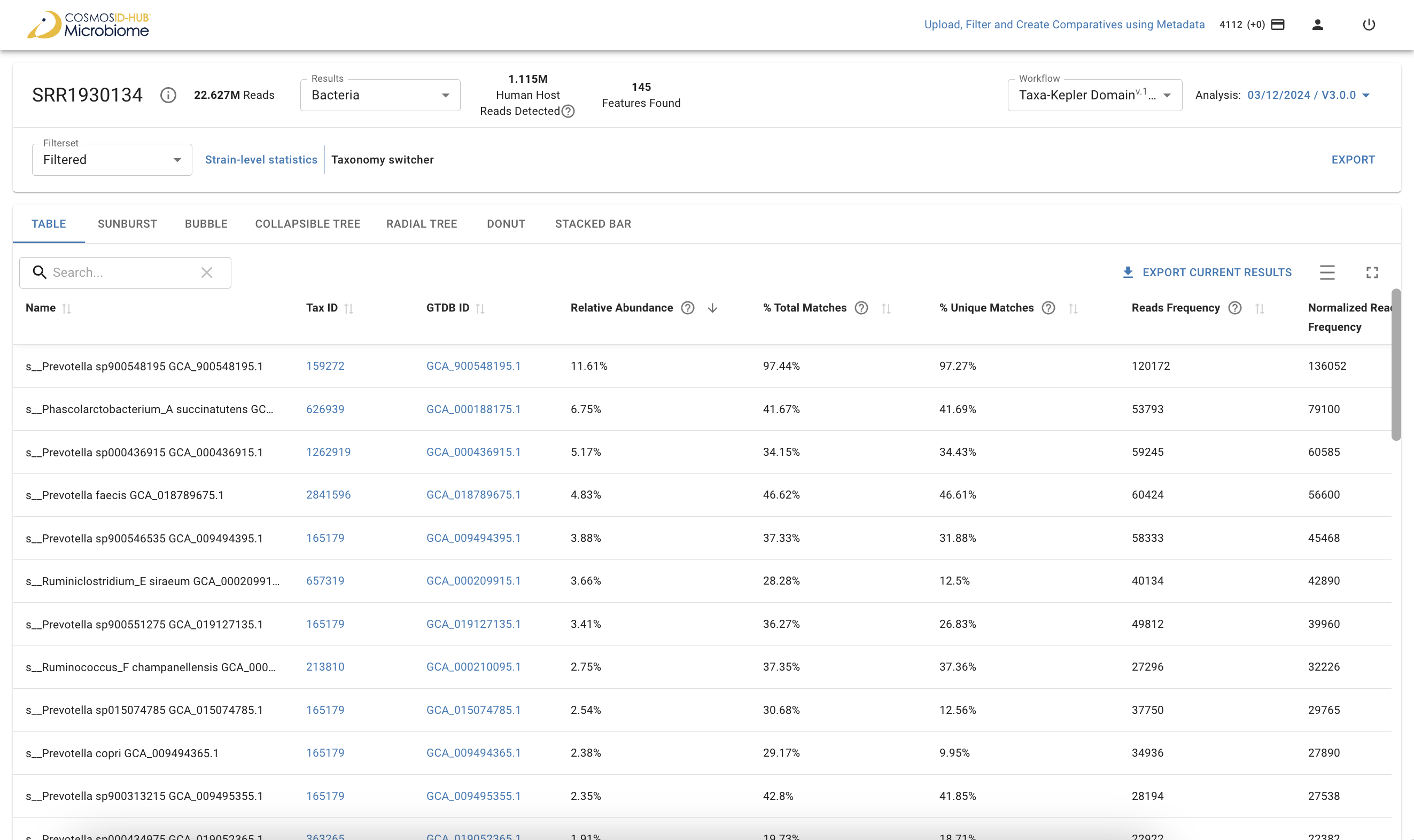 - Normalized Reads Frequency - used to calculate the Relative Abundance (%). This is the number of reads but normalized according to the size of the reference genome. This ensures differences in read counts are not due to larger/smaller genomes and is suitable for downstream comparative analysis or differential abundance analysis.